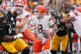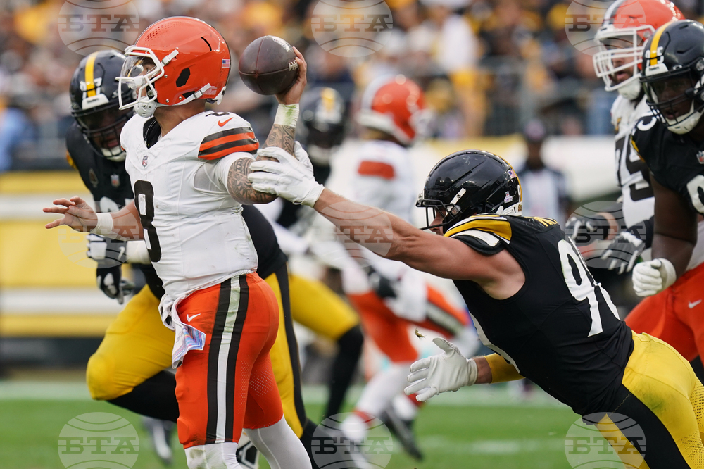 Cleveland Browns quarterback Dillon Gabriel (8) looks to pass before being sacked by Pittsburgh Steelers outside linebacker T.J. Watt in the first half of an NFL football game in Pittsburgh, Sunday, Oct. 12, 2025. (AP Photo/Gene J. Puskar)