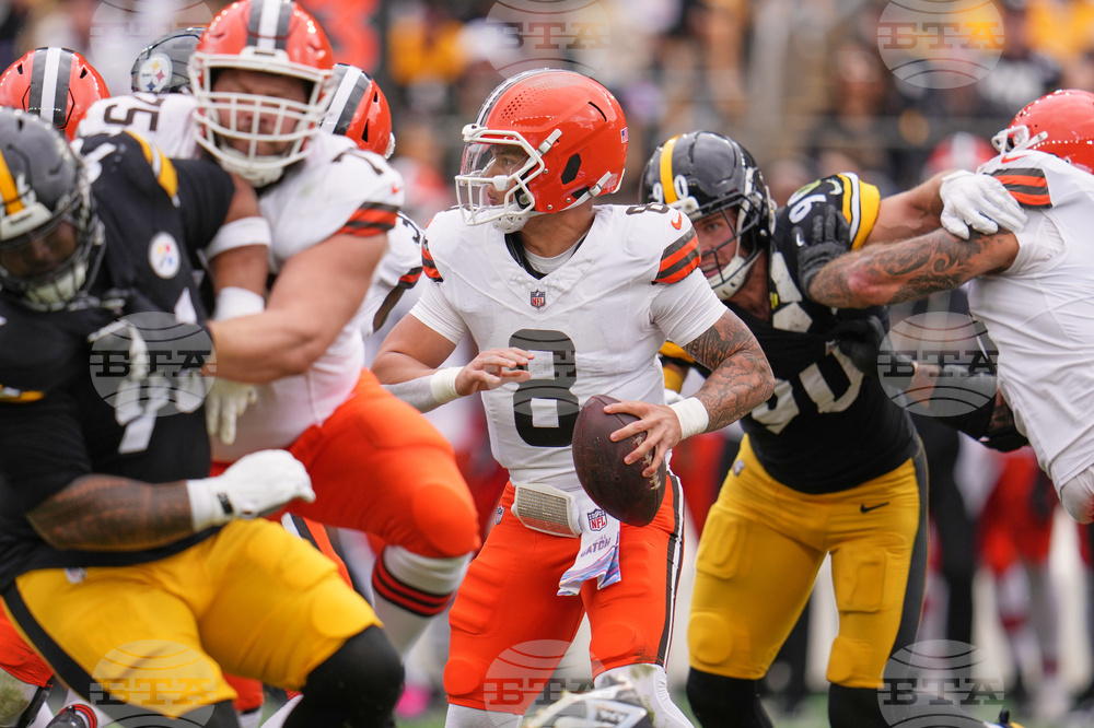 Cleveland Browns quarterback Dillon Gabriel (8) passes in the first half of an NFL football game against the Pittsburgh Steelers in Pittsburgh, Sunday, Oct. 12, 2025. (AP Photo/Matt Freed)