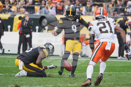 Pittsburgh Steelers kicker Chris Boswell (9) kicks a 48 yard field goal past Cleveland Browns cornerback Denzel Ward (21) as punter Corliss Waitman (3) holds in the first half of an NFL football game in Pittsburgh, Sunday, Oct. 12, 2025. (AP Photo/Gene J. Puskar)