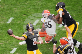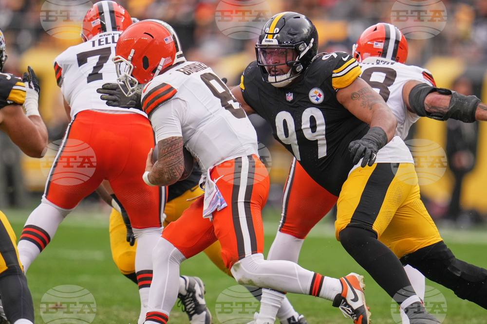 Pittsburgh Steelers defensive tackle Derrick Harmon (99) moves in to sack Cleveland Browns quarterback Dillon Gabriel (8) in the first half of an NFL football game in Pittsburgh, Sunday, Oct. 12, 2025. (AP Photo/Gene J. Puskar)