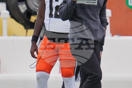Cleveland Browns defensive end Myles Garrett arrives for an NFL football game against the Pittsburgh Steelers in Pittsburgh, Sunday, Oct. 12, 2025. (AP Photo/Matt Freed)
