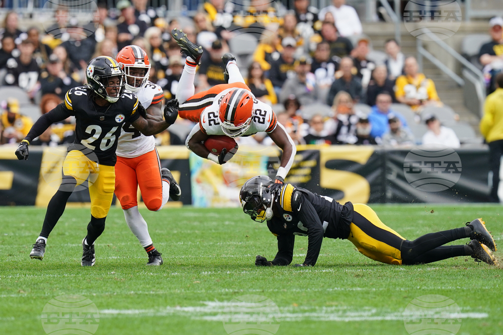 Cleveland Browns running back Dylan Sampson (22) is upended by Pittsburgh Steelers safety Juan Thornhill, right, on a kick off return after a field goal in the first half of an NFL football game in Pittsburgh, Sunday, Oct. 12, 2025. (AP Photo/Matt Freed)