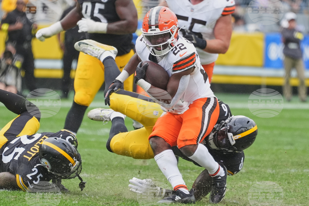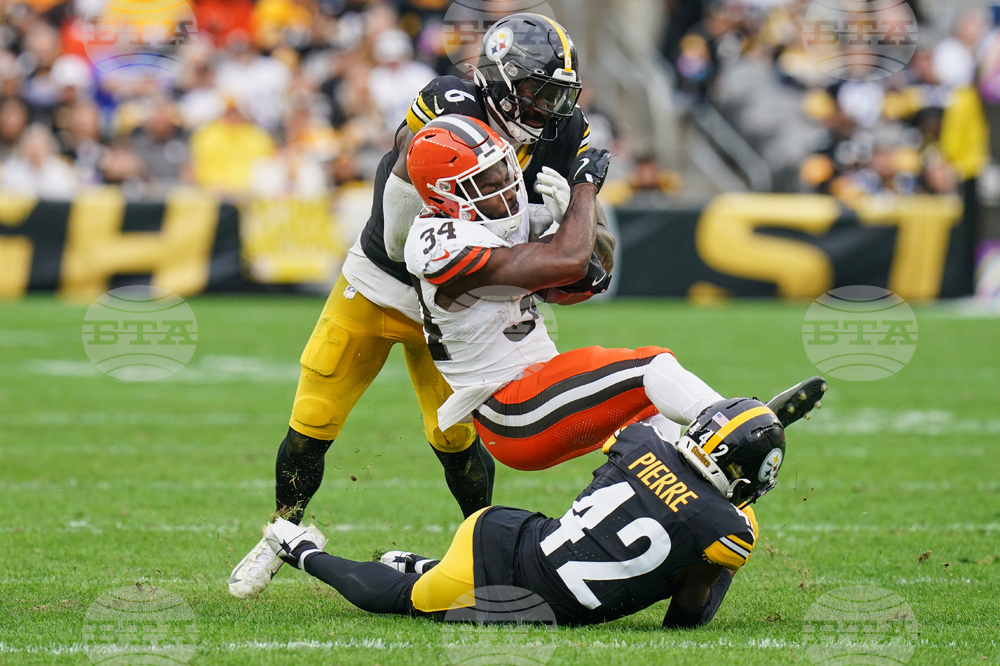 Cleveland Browns running back Jerome Ford (34) is tackled by Pittsburgh Steelers linebacker Patrick Queen, rear, and cornerback James Pierre (42) in the second half of an NFL football game in Pittsburgh, Sunday, Oct. 12, 2025. (AP Photo/Matt Freed)