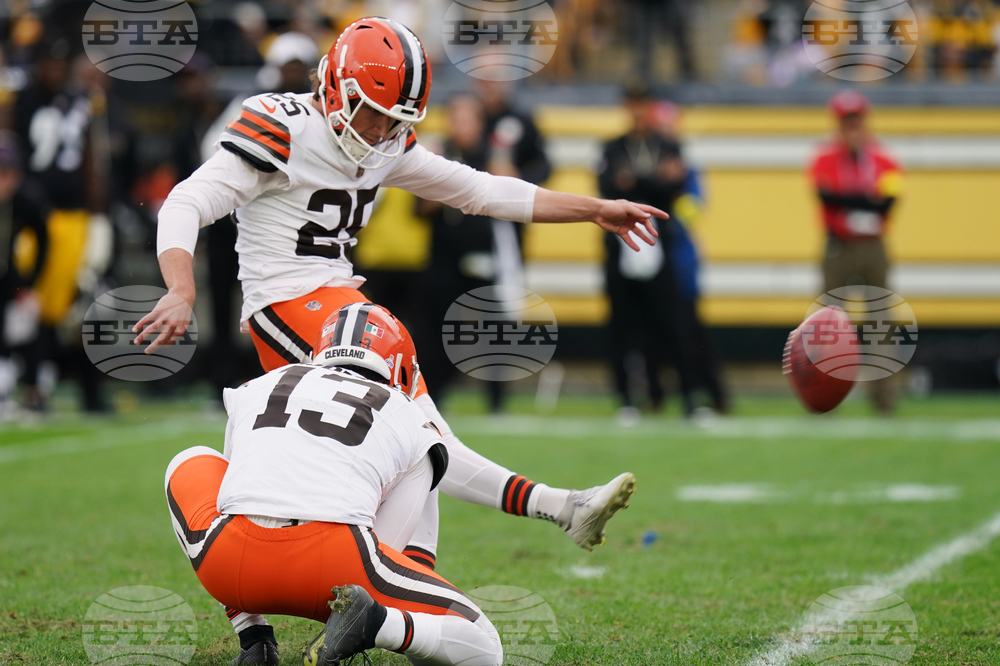 Cleveland Browns kicker Andre Szmyt (25) kicks a 32 yard field goal as punter Corey Bojorquez (13) holds in the second half of an NFL football game against the Pittsburgh Steelers in Pittsburgh, Sunday, Oct. 12, 2025. (AP Photo/Gene J. Puskar)