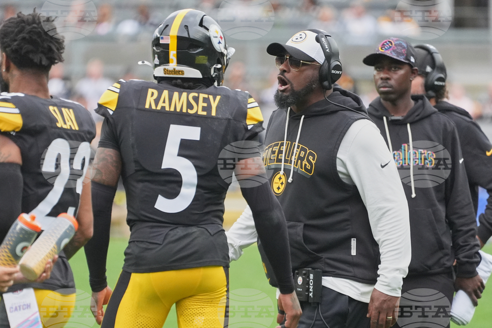 Pittsburgh Steelers head coach Mike Tomlin, right, talks with cornerback Jalen Ramsey (5) in the first half of an NFL football game against the Cleveland Browns in Pittsburgh, Sunday, Oct. 12, 2025. (AP Photo/Gene J. Puskar)