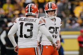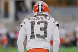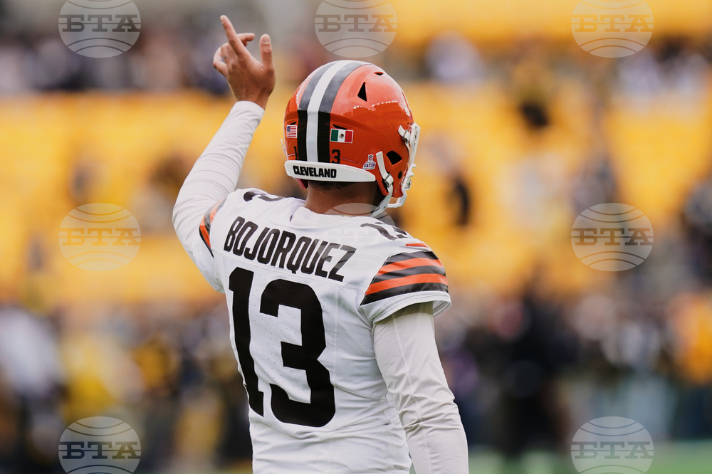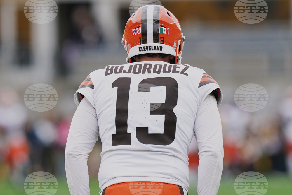 Cleveland Browns punter Corey Bojorquez (13) wears USA flag and Mexico flag stickers on his helmet for an NFL football game against the Pittsburgh Steelers in Pittsburgh, Sunday, Oct. 12, 2025. (AP Photo/Matt Freed)