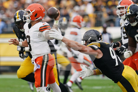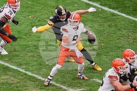 Cleveland Browns quarterback Dillon Gabriel (8) passes under pressure from Pittsburgh Steelers outside linebacker T.J. Watt (90) in the second half of an NFL football game in Pittsburgh, Sunday, Oct. 12, 2025. (AP Photo/Gene J. Puskar)