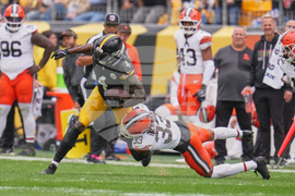 Pittsburgh Steelers wide receiver DK Metcalf (4) is tackled by Cleveland Browns safety Ronnie Hickman Jr. (33) in the first half of an NFL football game in Pittsburgh, Sunday, Oct. 12, 2025. (AP Photo/Gene J. Puskar)