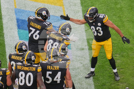 Pittsburgh Steelers tight end Connor Heyward (83) celebrates his touchdown with tight end Pat Freiermuth, center, an other teammates in the second half of an NFL football game against the Cleveland Browns in Pittsburgh, Sunday, Oct. 12, 2025. (AP Photo/Matt Freed)