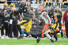 Pittsburgh Steelers running back Jaylen Warren (30) carries as Cleveland Browns linebacker Mohamoud Diabate (43) defends in the second half of an NFL football game in Pittsburgh, Sunday, Oct. 12, 2025. (AP Photo/Matt Freed)