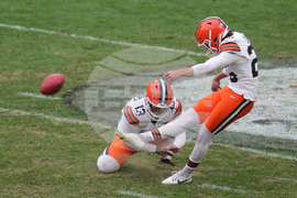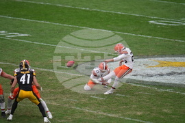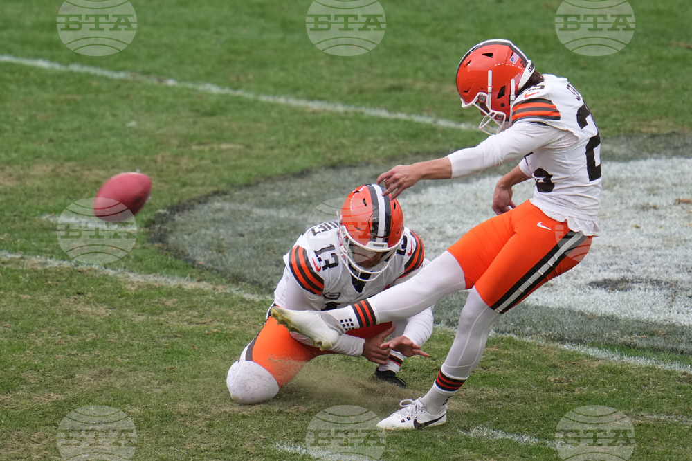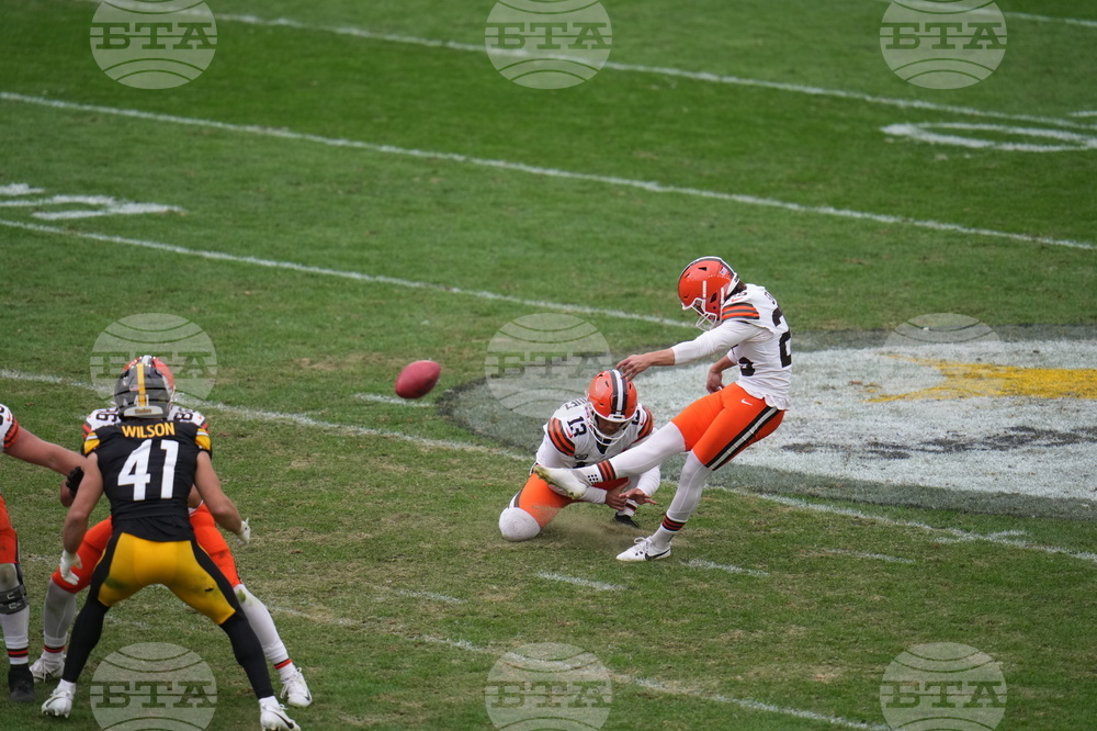 Cleveland Browns kicker Andre Szmyt (25) kicks a field goal as punter Corey Bojorquez (13) holds in the second half of an NFL football game against the Pittsburgh Steelers in Pittsburgh, Sunday, Oct. 12, 2025 (AP Photo/Gene J. Puskar)