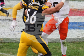 Pittsburgh Steelers linebacker Nick Herbig (51) sacks Cleveland Browns quarterback Dillon Gabriel (8) in the second half of an NFL football game in Pittsburgh, Sunday, Oct. 12, 2025. (AP Photo/Matt Freed)