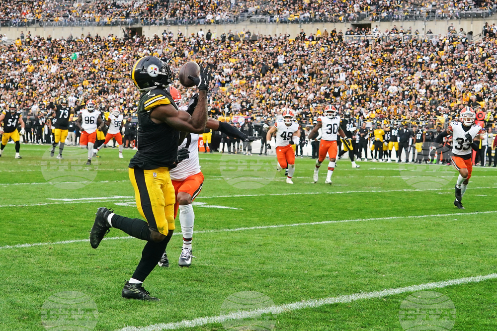 Pittsburgh Steelers wide receiver DK Metcalf (4) catches a pass for a touchdown in the second half of an NFL football game against the Cleveland Browns in Pittsburgh, Sunday, Oct. 12, 2025. (AP Photo/Matt Freed)