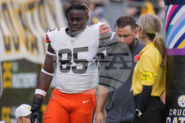 Cleveland Browns tight end David Njoku (85) is led off the field in the second half of an NFL football game against the Pittsburgh Steelers in Pittsburgh, Sunday, Oct. 12, 2025. (AP Photo/Gene J. Puskar)