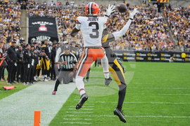 Pittsburgh Steelers wide receiver DK Metcalf (4) is pursued by Cleveland Browns safety Rayshawn Jenkins (5) in the second half of an NFL football game in Pittsburgh, Sunday, Oct. 12, 2025. (AP Photo/Matt Freed)