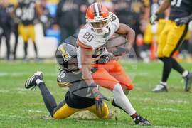 Pittsburgh Steelers tight end Jonnu Smith, left, catches a pass as Cleveland Browns cornerback Denzel Ward (21) defends in the first half of an NFL football game in Pittsburgh, Sunday, Oct. 12, 2025. (AP Photo/Matt Freed)