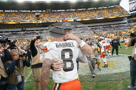 Cleveland Browns kicker Andre Szmyt (25) is congratulated by Corey Bojorquez (13) after kicking a field goal in the first half of an NFL football game against the Pittsburgh Steelers in Pittsburgh, Sunday, Oct. 12, 2025. (AP Photo/Matt Freed)