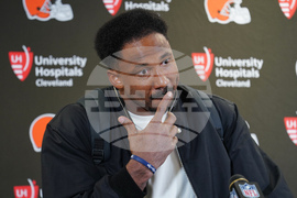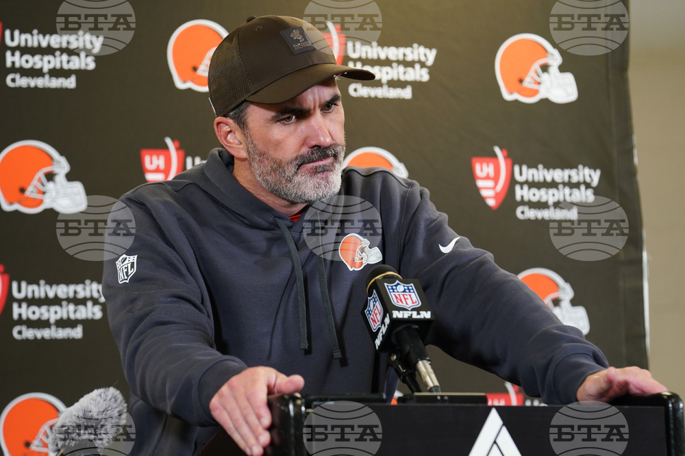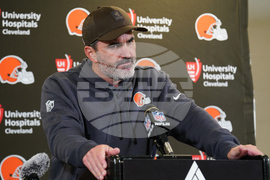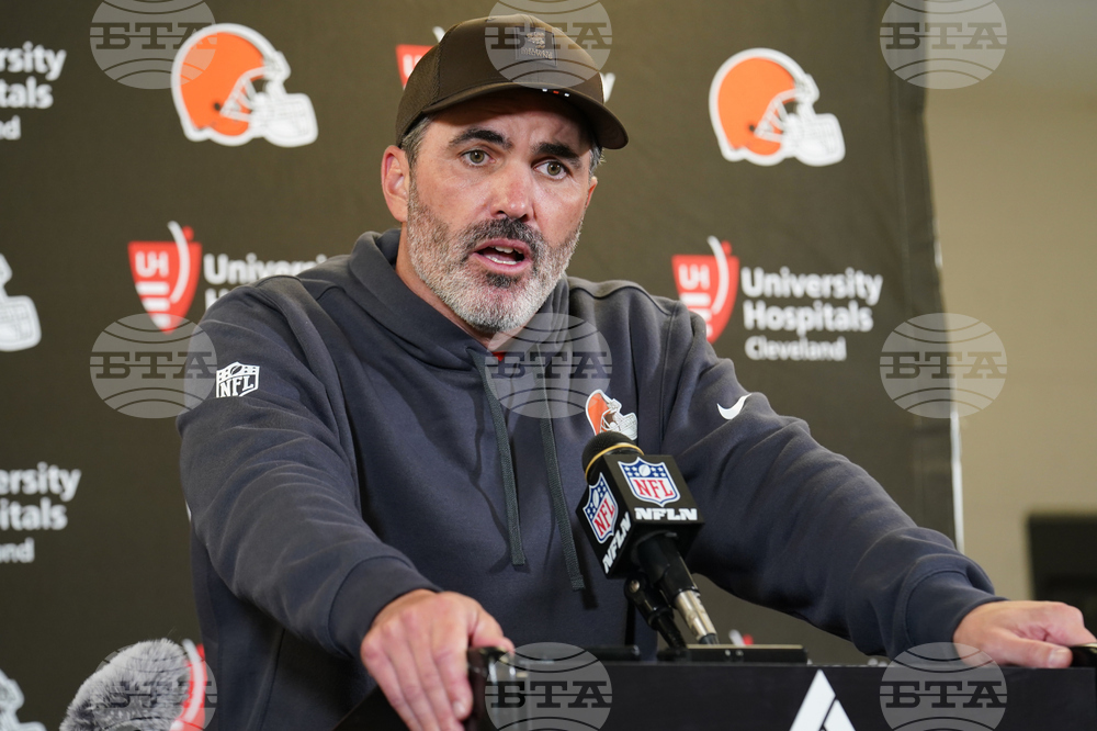Cleveland Browns head coach Kevin Stefanski speaks during a news conference following an NFL football game against the Pittsburgh Steelers in Pittsburgh, Sunday, Oct. 12, 2025. (AP Photo/Matt Freed)