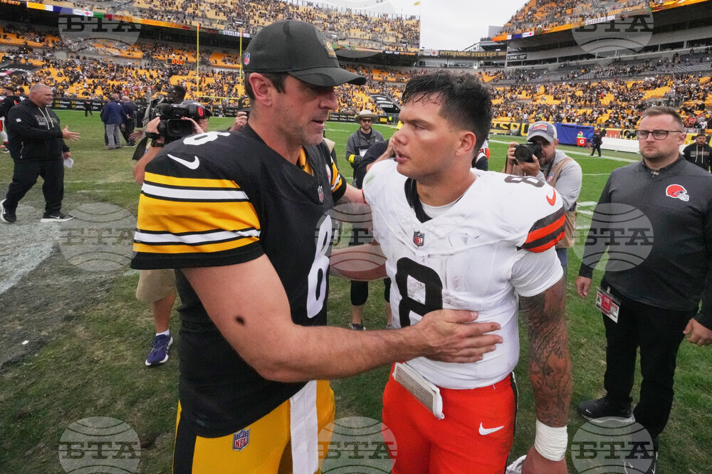 Pittsburgh Steelers quarterback Aaron Rodgers, left, and Cleveland Browns quarterback Dillon Gabriel, right, greet each other after their NFL football game in Pittsburgh, Sunday, Oct. 12, 2025. (AP Photo/Gene J. Puskar)