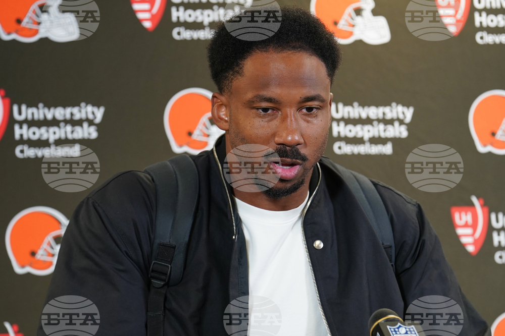 Cleveland Browns defensive end Myles Garrett (95) speaks at a news conference after an NFL football game against the Pittsburgh Steelers in Pittsburgh, Sunday, Oct. 12, 2025. (AP Photo/Matt Freed)