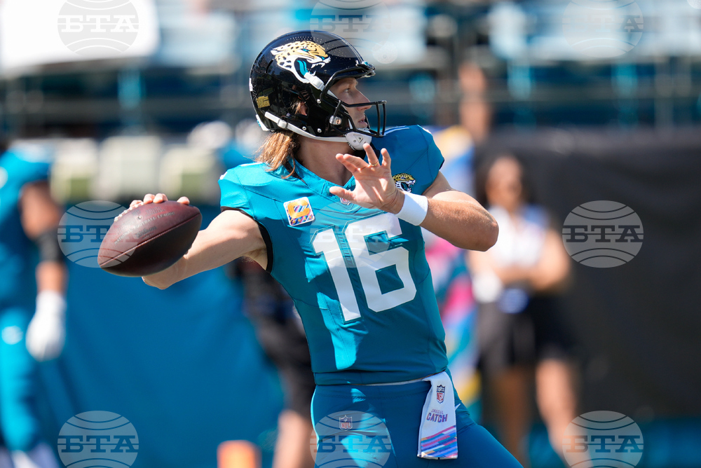 Jacksonville Jaguars quarterback Trevor Lawrence warms up before an NFL football game against the Seattle Seahawks, Sunday, Oct. 12 2025, in Jacksonville, Fla. (AP Photo/John Raoux)