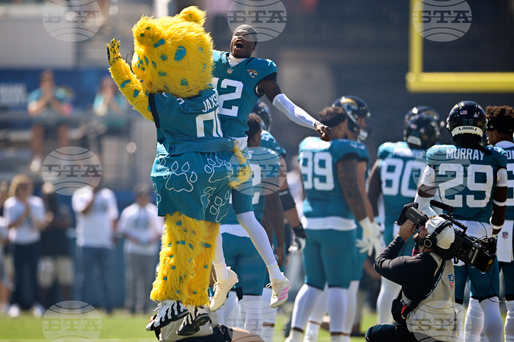 Jacksonville Jaguars wide receiver Travis Hunter chest bumps with the team mascot Jaxson de Ville before an NFL football game against the Seattle Seahawks, Sunday, Oct. 12 2025, in Jacksonville, Fla. (AP Photo/Phelan M. Ebenhack)