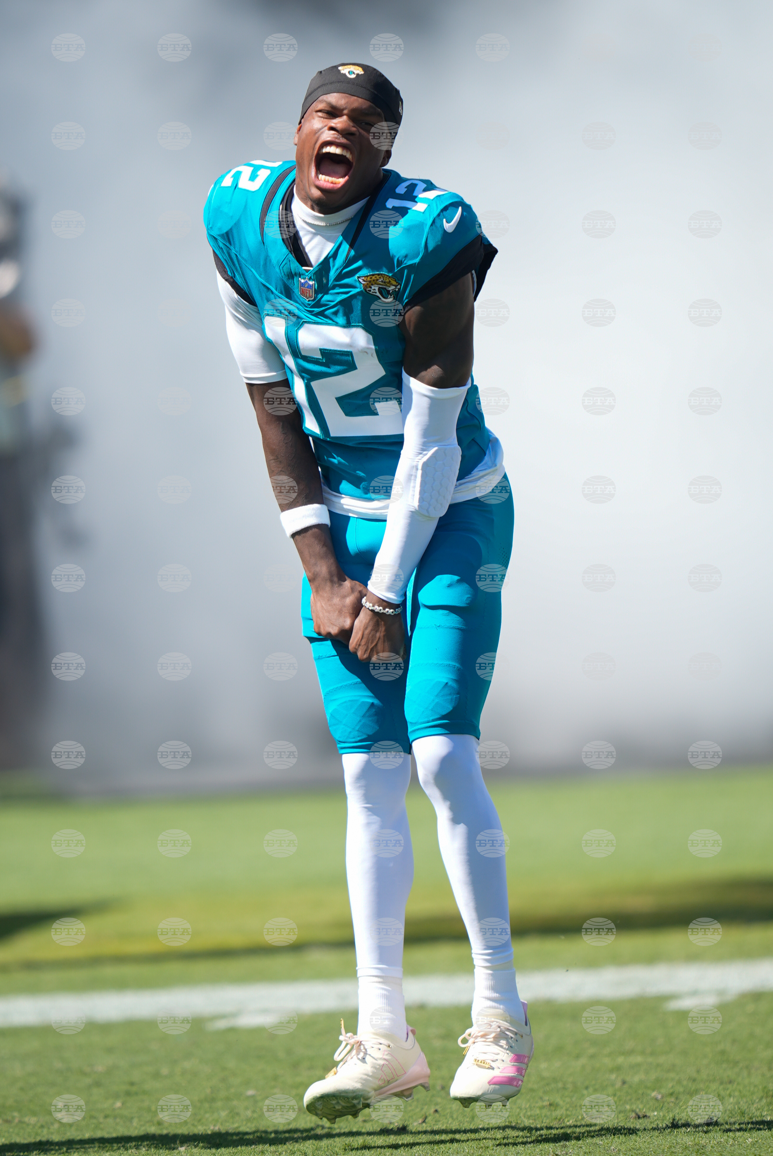 Jacksonville Jaguars wide receiver Travis Hunter reacts during player introductions before an NFL football game against the Seattle Seahawks, Sunday, Oct. 12 2025, in Jacksonville, Fla. (AP Photo/John Raoux)