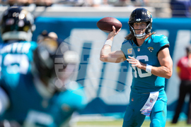 Jacksonville Jaguars quarterback Trevor Lawrence looks to throw during the first half of an NFL football game against the Seattle Seahawks, Sunday, Oct. 12 2025, in Jacksonville, Fla. (AP Photo/John Raoux)
