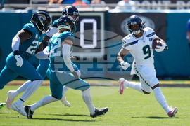 Seattle Seahawks running back Kenneth Walker III (9) runs out of bounds as Jacksonville Jaguars defend during the first half of an NFL football game Sunday, Oct. 12 2025, in Jacksonville, Fla. (AP Photo/John Raoux)