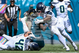 Jacksonville Jaguars running back Travis Etienne (1) is tackled by Seattle Seahawks linebacker Drake Thomas (42) and linebacker Ernest Jones IV (13) after rushing the ball during the first half of an NFL football game Sunday, Oct. 12 2025, in Jacksonville, Fla. (AP Photo/Phelan M. Ebenhack)
