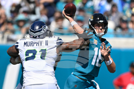 Jacksonville Jaguars quarterback Trevor Lawrence (16) throws a pass as Seattle Seahawks' Byron Murphy II (91) defends during the first half of an NFL football game Sunday, Oct. 12 2025, in Jacksonville, Fla. (AP Photo/Phelan M. Ebenhack)