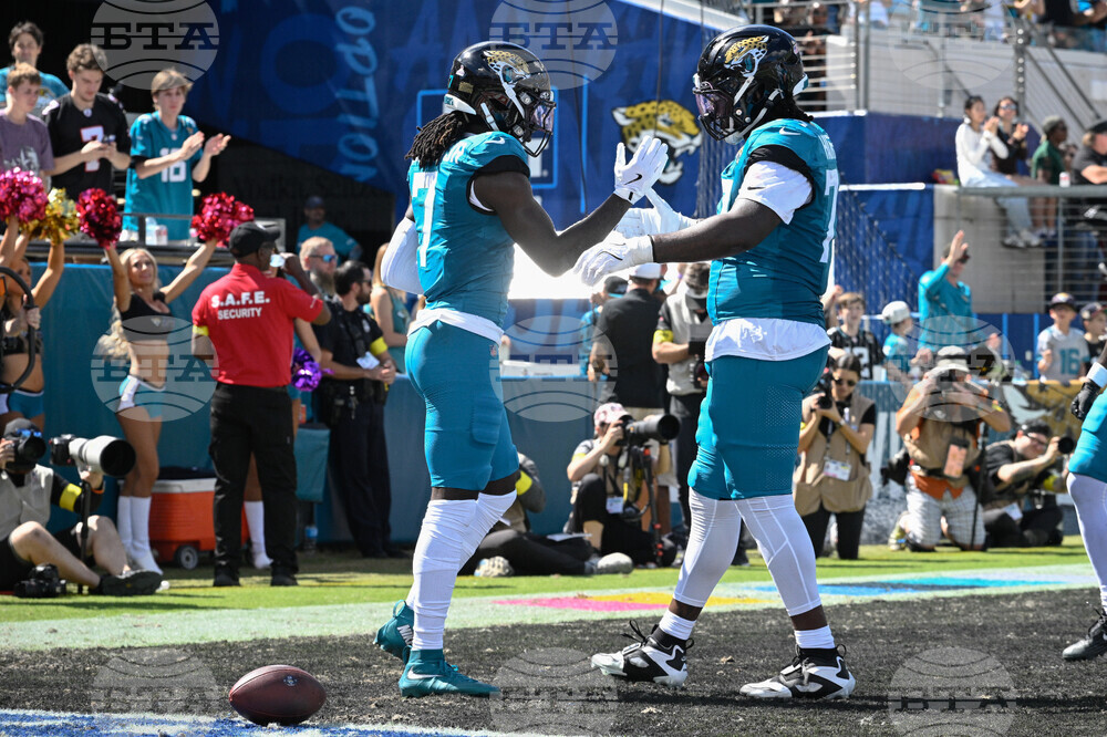 Jacksonville Jaguars wide receiver Brian Thomas Jr. (7) celebrates his touchdown with offensive tackle Anton Harrison (77) during the first half of an NFL football game against the Seattle Seahawks, Sunday, Oct. 12 2025, in Jacksonville, Fla. (AP Photo/Phelan M. Ebenhack)