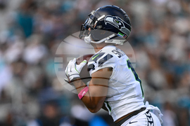 Seattle Seahawks running back Kenneth Walker III (9) carries the ball during the first half of an NFL football game against the Jacksonville Jaguars, Sunday, Oct. 12 2025, in Jacksonville, Fla. (AP Photo/Phelan M. Ebenhack)