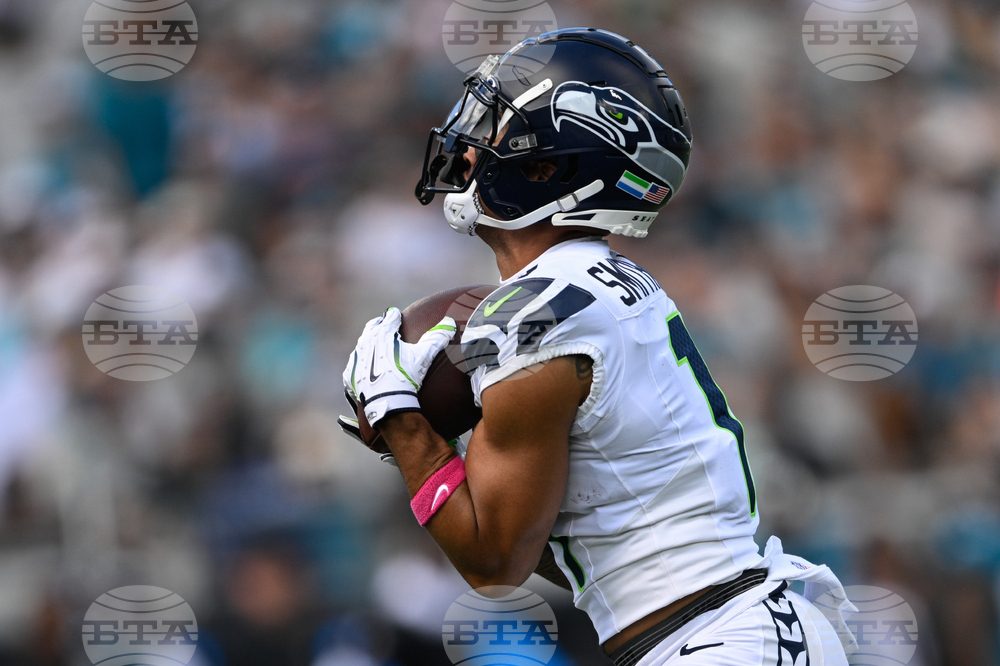 Seattle Seahawks wide receiver Jaxon Smith-Njigba catches a touchdown pass on a 61-yard pass play during the first half of an NFL football game against the Jacksonville Jaguars, Sunday, Oct. 12 2025, in Jacksonville, Fla. (AP Photo/Phelan M. Ebenhack)