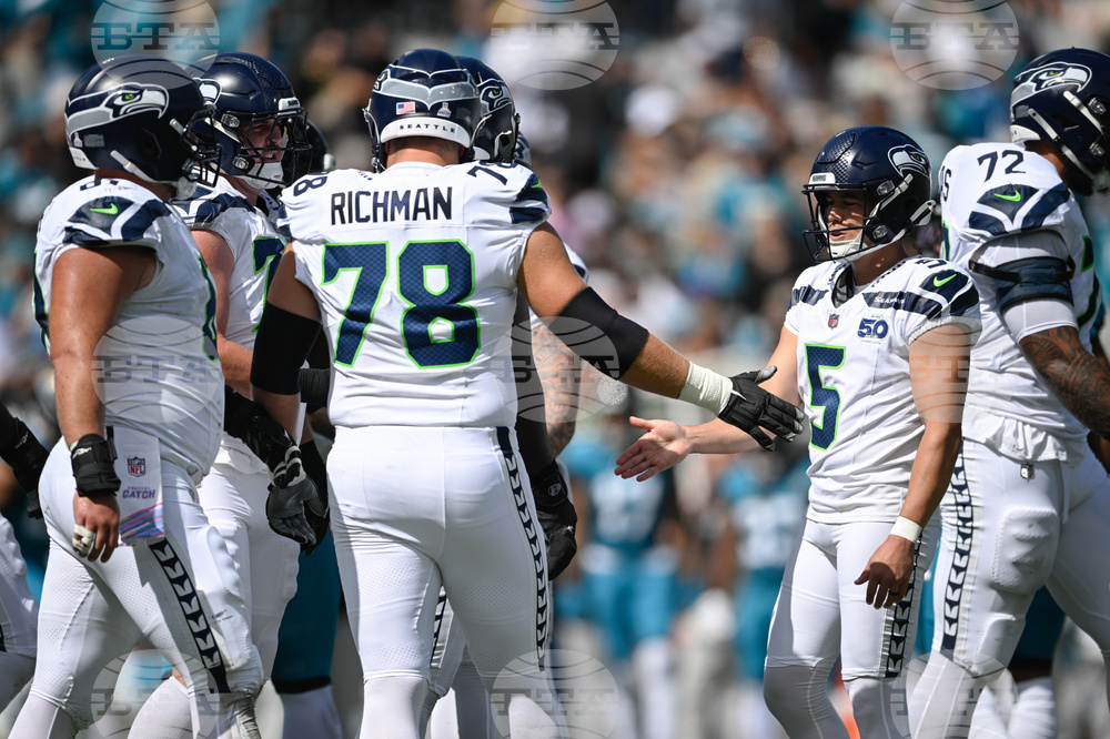 Seattle Seahawks kicker Jason Myers (5) is congratulated by guard Mason Richman (78) after kicking a field goal during the first half of an NFL football game against the Jacksonville Jaguars, Sunday, Oct. 12 2025, in Jacksonville, Fla. (AP Photo/Phelan M. Ebenhack)