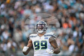 Seattle Seahawks defensive end Leonard Williams (99) reacts after sacking Jacksonville Jaguars quarterback Trevor Lawrence during the first half of an NFL football game Sunday, Oct. 12 2025, in Jacksonville, Fla. (AP Photo/Phelan M. Ebenhack)
