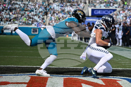 Jacksonville Jaguars cornerback Montaric Brown (30) breaks up a pass intended for Seattle Seahawks wide receiver Jaxon Smith-Njigba (11) during the second half of an NFL football game Sunday, Oct. 12 2025, in Jacksonville, Fla. (AP Photo/John Raoux)