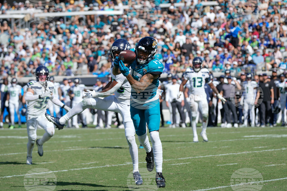 Jacksonville Jaguars wide receiver Brian Thomas Jr. (7) pulls in a reception in front of Seattle Seahawks safety Coby Bryant during the first half of an NFL football game Sunday, Oct. 12 2025, in Jacksonville, Fla.(AP Photo/John Raoux)