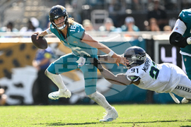 Jacksonville Jaguars quarterback Trevor Lawrence (16) escapes from Seattle Seahawks defensive tackle Byron Murphy II (91) during the second half of an NFL football game Sunday, Oct. 12 2025, in Jacksonville, Fla. (AP Photo/Phelan M. Ebenhack)
