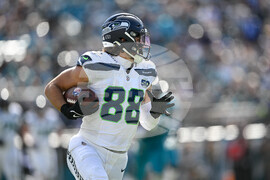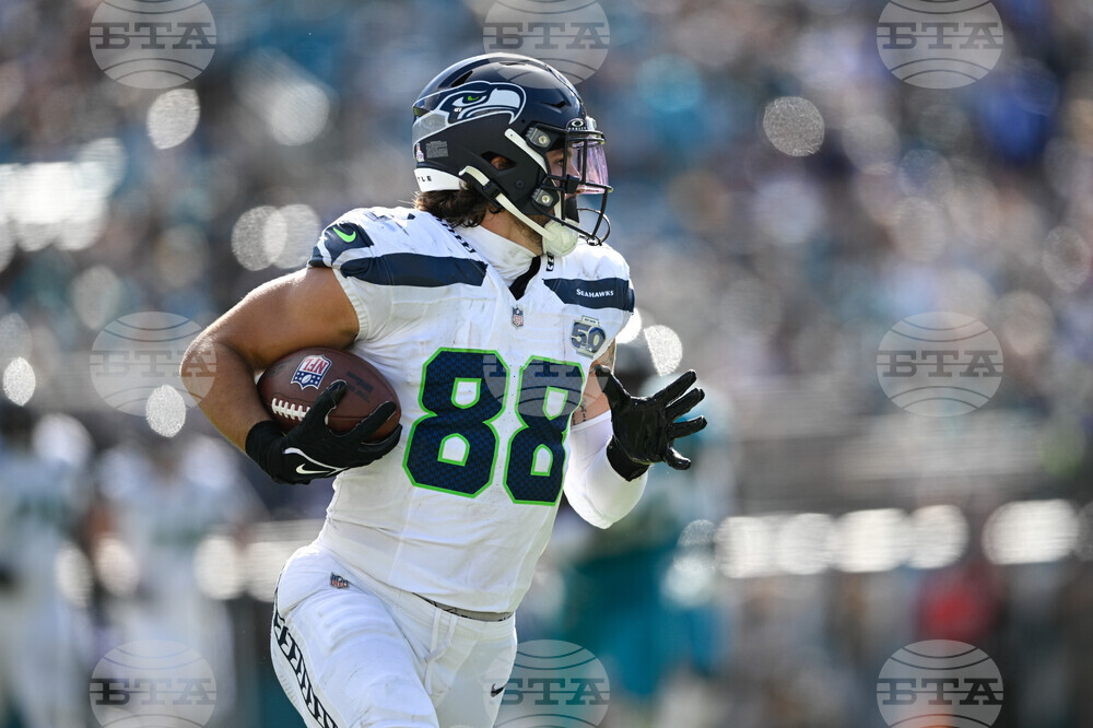 Seattle Seahawks tight end AJ Barner (88) runs after catching a pass during the second half of an NFL football game against the Jacksonville Jaguars, Sunday, Oct. 12 2025, in Jacksonville, Fla. (AP Photo/Phelan M. Ebenhack)