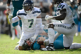 Jacksonville Jaguars quarterback Trevor Lawrence (16) is tripped up by Seattle Seahawks defensive end Leonard Williams, bottom right, after trying to get yardage during the first half of an NFL football game Sunday, Oct. 12 2025, in Jacksonville, Fla. (AP Photo/Phelan M. Ebenhack)