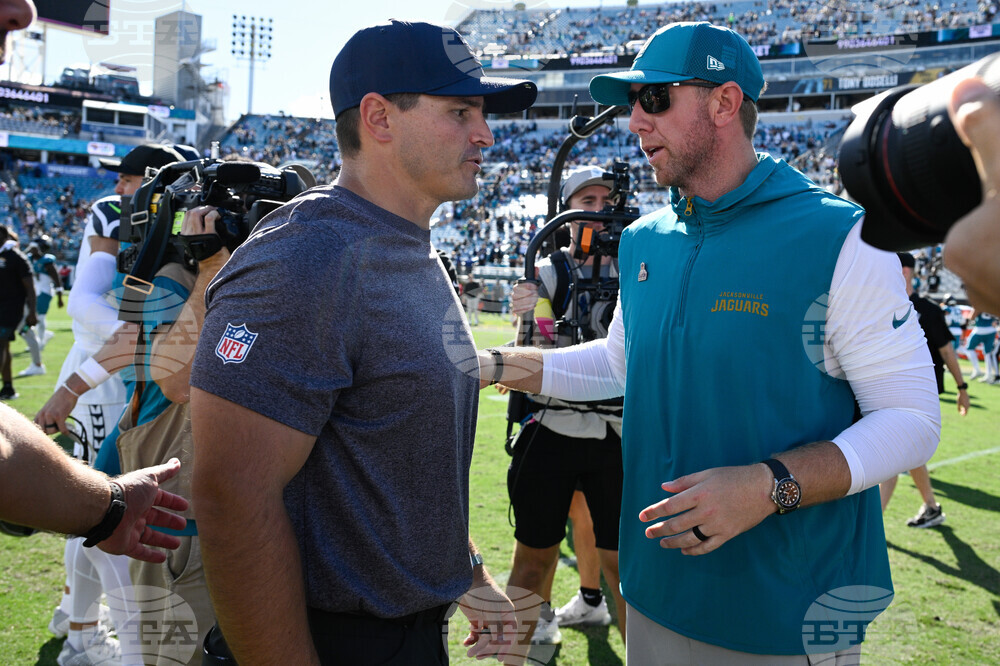Seattle Seahawks head coach Mike MacDonald, left, and Jacksonville Jaguars head coach Liam Coen talk after an NFL football game Sunday, Oct. 12 2025, in Jacksonville, Fla. (AP Photo/Phelan M. Ebenhack)