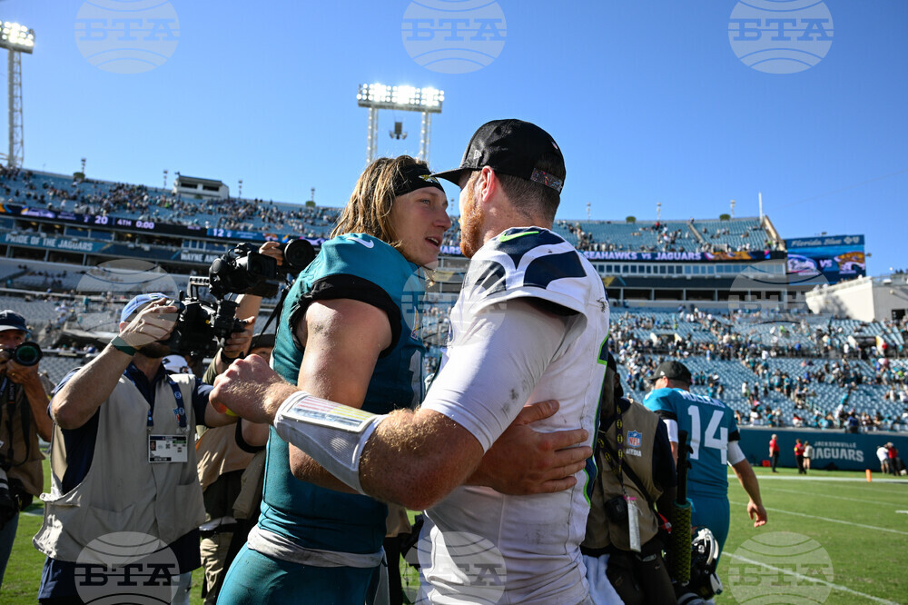 Jacksonville Jaguars quarterback Trevor Lawrence greets Seattle Seahawks quarterback Jalen Milroe (6) after an NFL football game Sunday, Oct. 12 2025, in Jacksonville, Fla. (AP Photo/John Raoux)