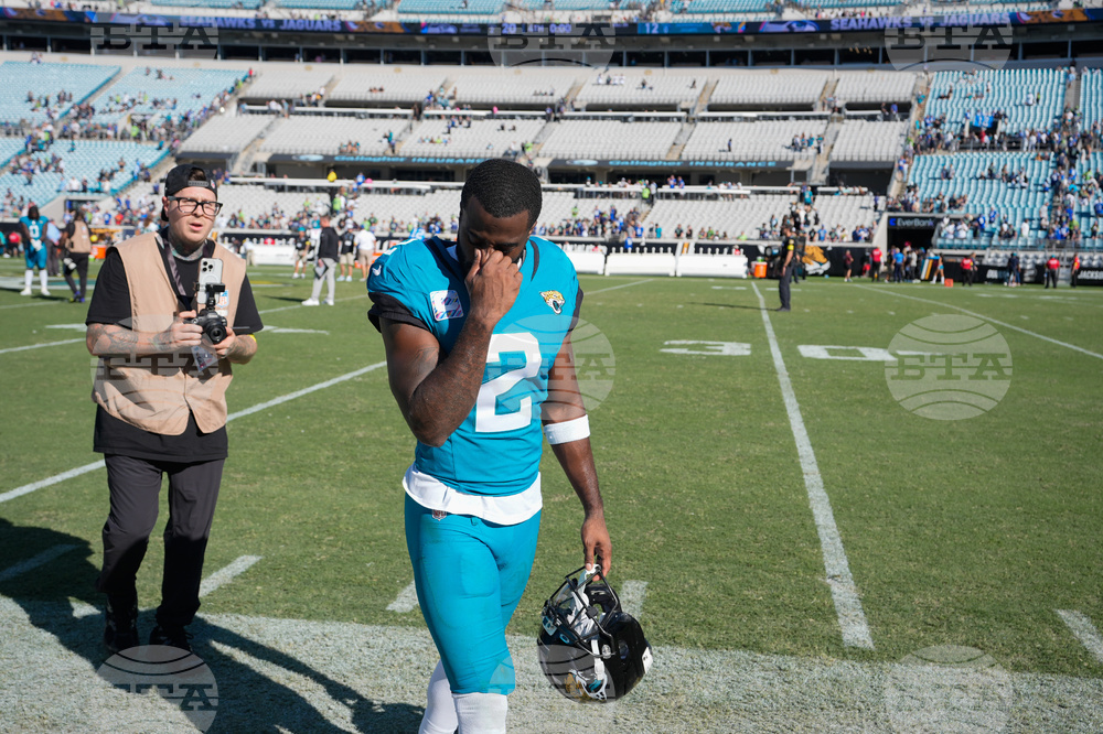 Jacksonville Jaguars cornerback Jourdan Lewis (2) leaves the field after an NFL football game against the Seattle Seahawks, Sunday, Oct. 12 2025, in Jacksonville, Fla. (AP Photo/John Raoux)