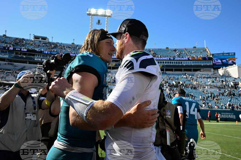 Jacksonville Jaguars quarterback Trevor Lawrence, left, and Seattle Seahawks quarterback Sam Darnold greet each other after an NFL football game Sunday, Oct. 12 2025, in Jacksonville, Fla. (AP Photo/Phelan M. Ebenhack)