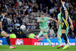 Scotland's Che Adams scores a goal that was later disallowed by VAR during the World Cup 2026 group C qualifying soccer match between Scotland and Belarus at Hampden Park in Glasgow, Scotland, Sunday, Oct. 12, 2025. (Owen Humphreys/PA via AP)