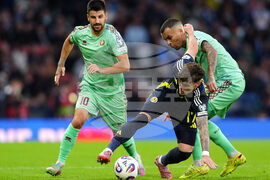 Scotland's Che Adams is fouled by Belarus' Egor Parkhomenko during the World Cup 2026 group C qualifying soccer match between Scotland and Belarus at Hampden Park in Glasgow, Scotland, Sunday, Oct. 12, 2025. (Steve Welsh/PA via AP)