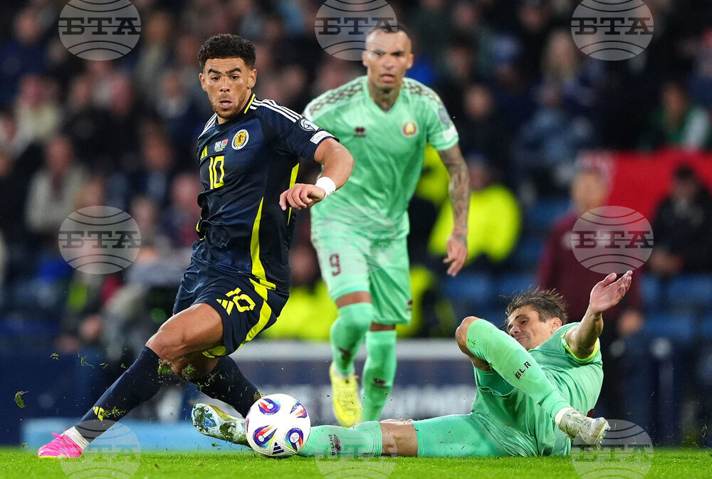 Belarus' Gleb Kuchko scores their side's first goal during the World Cup 2026 group C qualifying soccer match between Scotland and Belarus at Hampden Park in Glasgow, Scotland, Sunday, Oct. 12, 2025. (Steve Welsh/PA via AP)