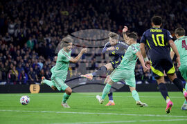 Scotland's Scott McTominay, centre, scores their side's second goal during the World Cup 2026 group C qualifying soccer match between Scotland and Belarus at Hampden Park in Glasgow, Scotland, Sunday, Oct. 12, 2025. (Steve Welsh/PA via AP)