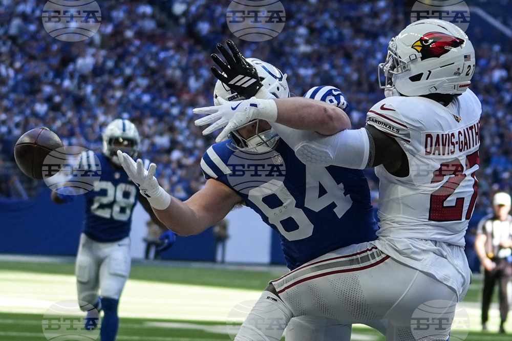 Indianapolis Colts tight end Tyler Warren (84) misses the catch against Arizona Cardinals linebacker Akeem Davis-Gaither (27) in the first half of an NFL football game, Sunday, Oct. 12, 2025, in Indianapolis, Ind. (AP Photo/Michael Conroy)
